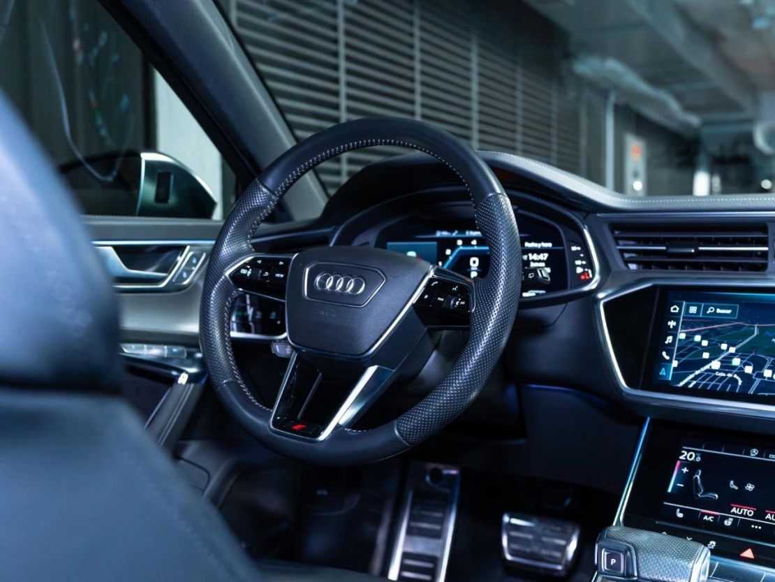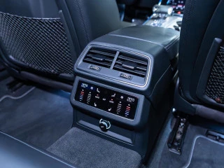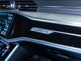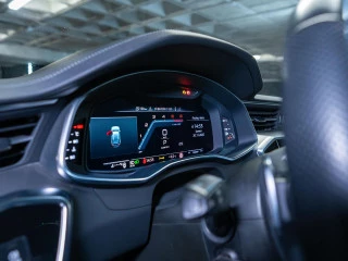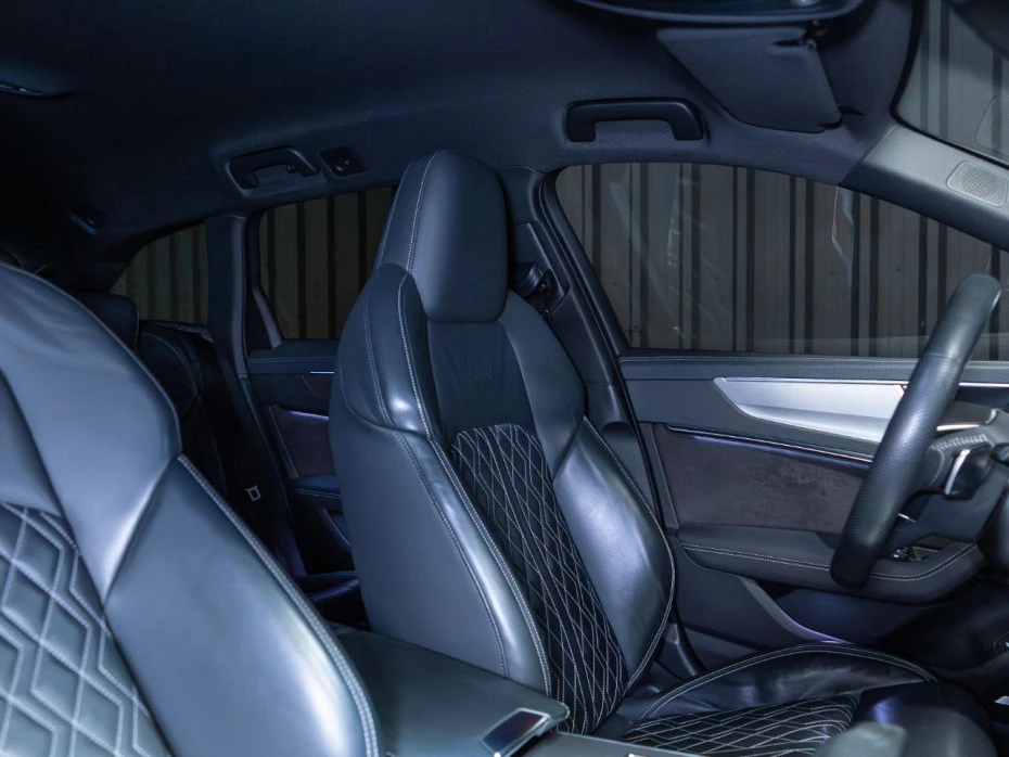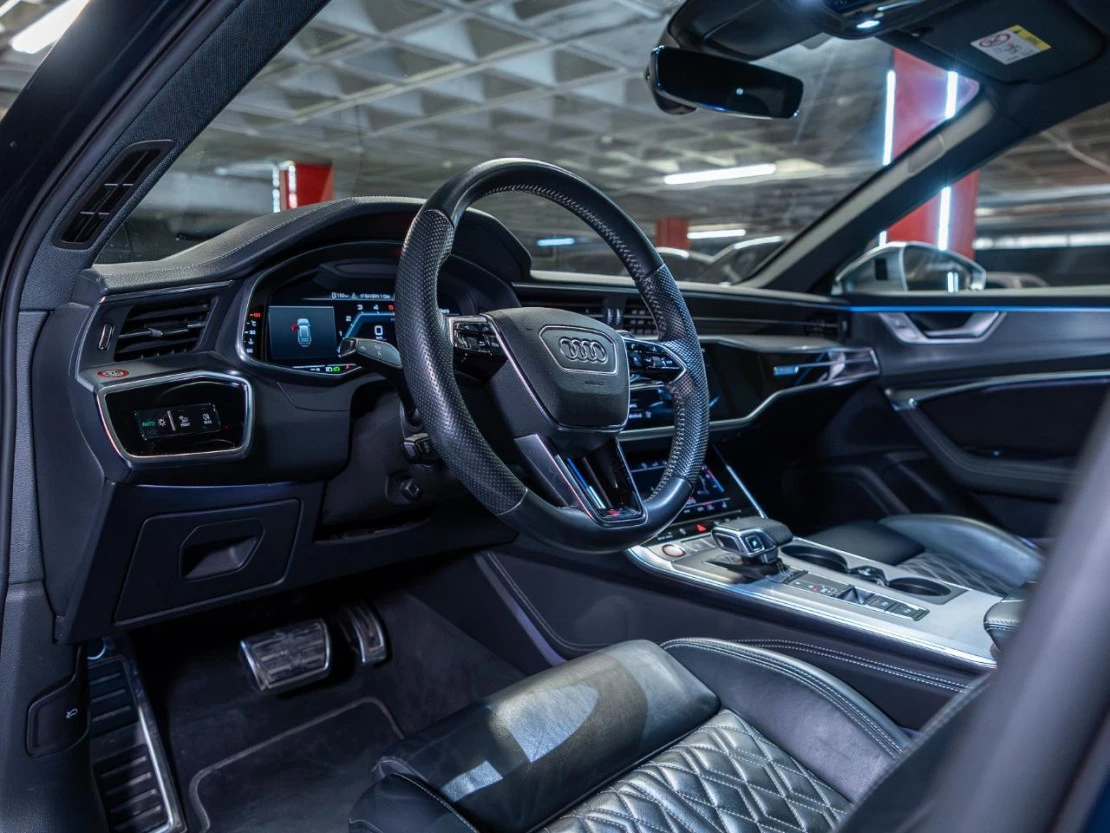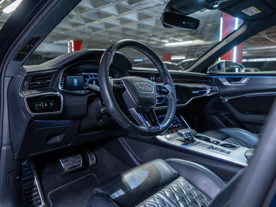 El habitáculo ofrece un confort premium gracias a su tapicería en cuero Valcona S line con paquete Audi Exclusive, asientos deportivos S calefactados tanto delanteros como traseros, y ajuste eléctrico con memoria. El ambiente interior se realza con el sistema de iluminación ambiental de contorno y el revestimiento en tela negra del techo.