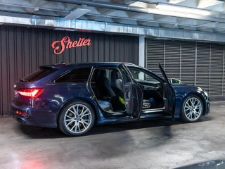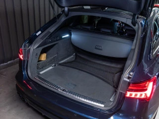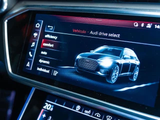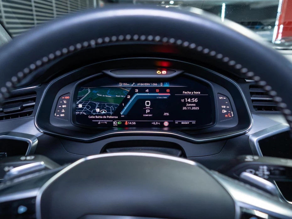 Este familiar deportivo combina la elegancia de su pintura personalizada Audi exclusive en azul Navarra metalizado con detalles deportivos como las llantas Audi Sport de 20" y barras longitudinales en negro mate. La suspensión regulable con control de amortiguación asegura un comportamiento dinámico excepcional.
