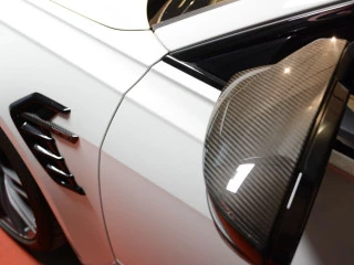 Lateral: Carcasas de retrovisores y faldones laterales específicos ABT en carbono.